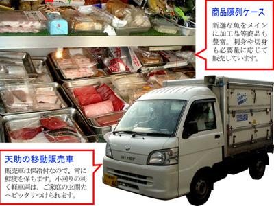 移動販売の天助はご家庭の玄関先までお伺いしています。しかも、魚をはじめ商品は見てお買物ができるので安心だし便利です。お買物にお困りなら天助がお役にたちます。